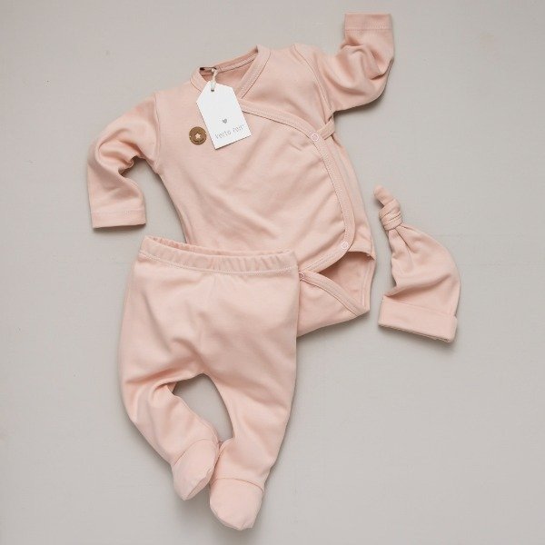 Éste mini ajuarcito es perfecto para los primeros días de tu bebé. El body cruzado o estilo oriental, es súper práctico para los primeros cambios gracias a su apertura total, que facilita el proceso al evitar manipular su cabecita.