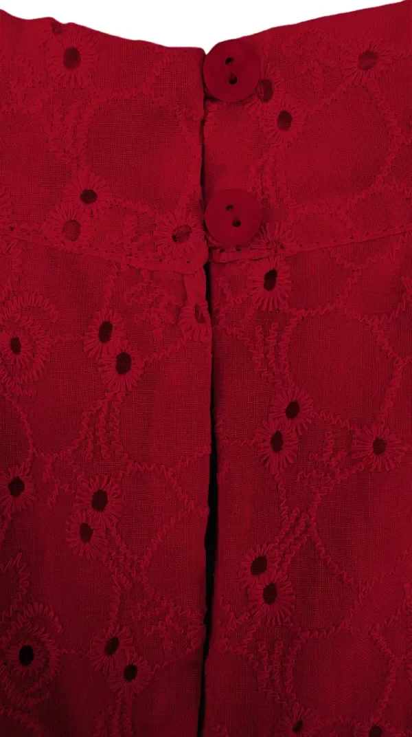 El Vestido Margot rojo se distingue por su diseño fino y femenino, elaborado con una tela bordada que aporta un estilo delicado y sofisticado. Cuenta con dos botones en la espalda que añaden un detalle elegante y práctico, facilitando su colocación.