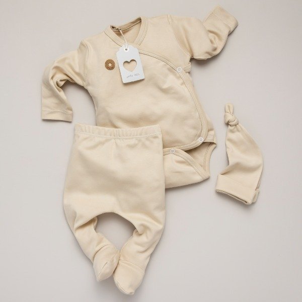 Éste mini ajuarcito es perfecto para los primeros días de tu bebé. El body cruzado o estilo oriental, es súper práctico para los primeros cambios gracias a su apertura total, que facilita el proceso al evitar manipular su cabecita.