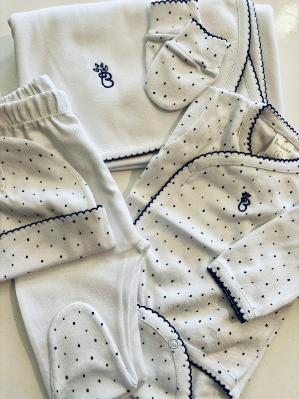 Este ajuar cuenta con lo básico para los primeros momentos. Para completarlo aún más les recomendamos sumarle una camperita en pima simple y, el enterito de apertura delantera