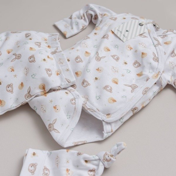 • Gorrito: Completa el conjunto con un gorrito con nudo, fabricado en 100% algodón peinado, utilizando la misma estampa.
