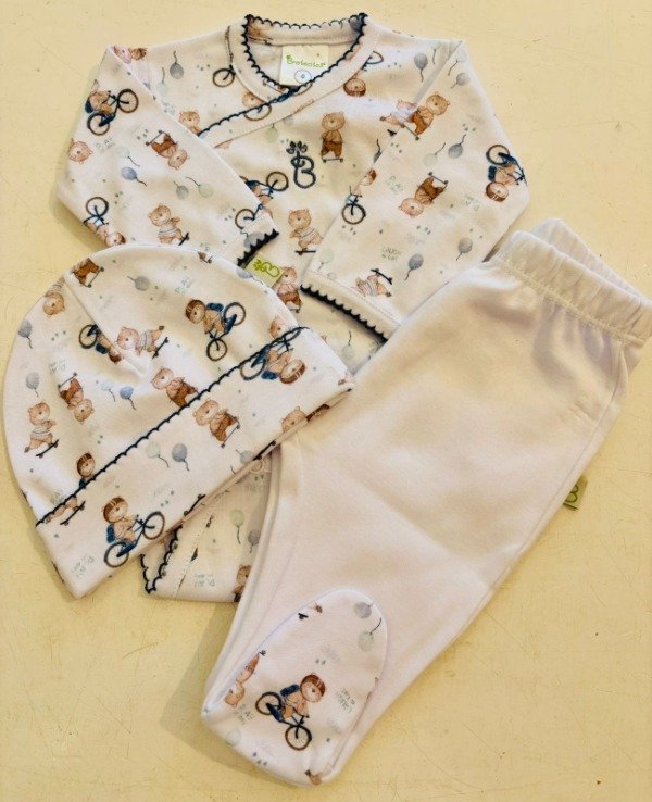 Este ajuar cuenta con lo básico para los primeros momentos. Para completarlo aún más les recomendamos sumarle una camperita en pima simple y, el enterito de apertura delantera