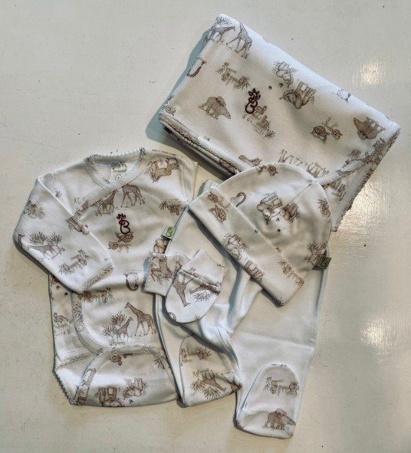 Este ajuar cuenta con lo básico para los primeros momentos. Para completarlo aún más les recomendamos sumarle una camperita en pima simple y, el enterito de apertura delantera