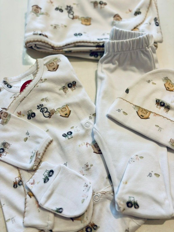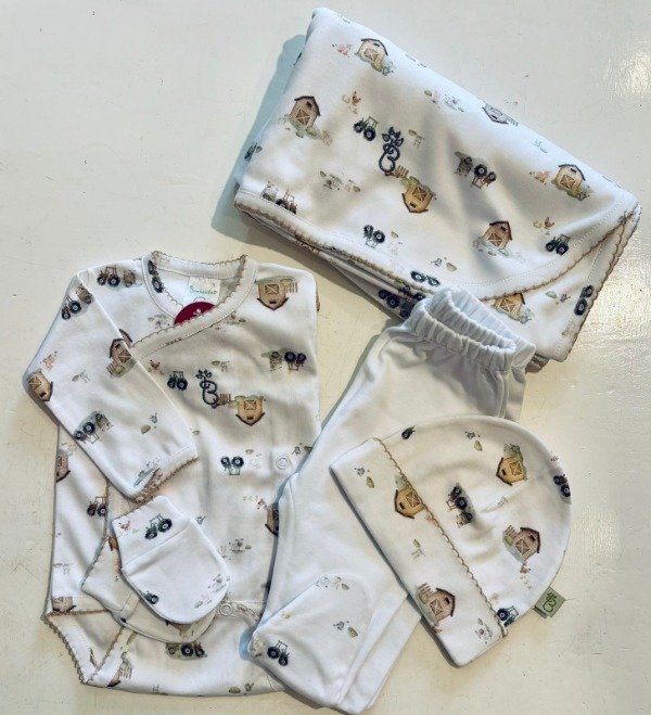 Este ajuar cuenta con lo básico para los primeros momentos. Para completarlo aún más les recomendamos sumarle una camperita en pima simple y, el enterito de apertura delantera