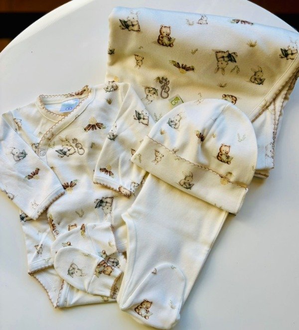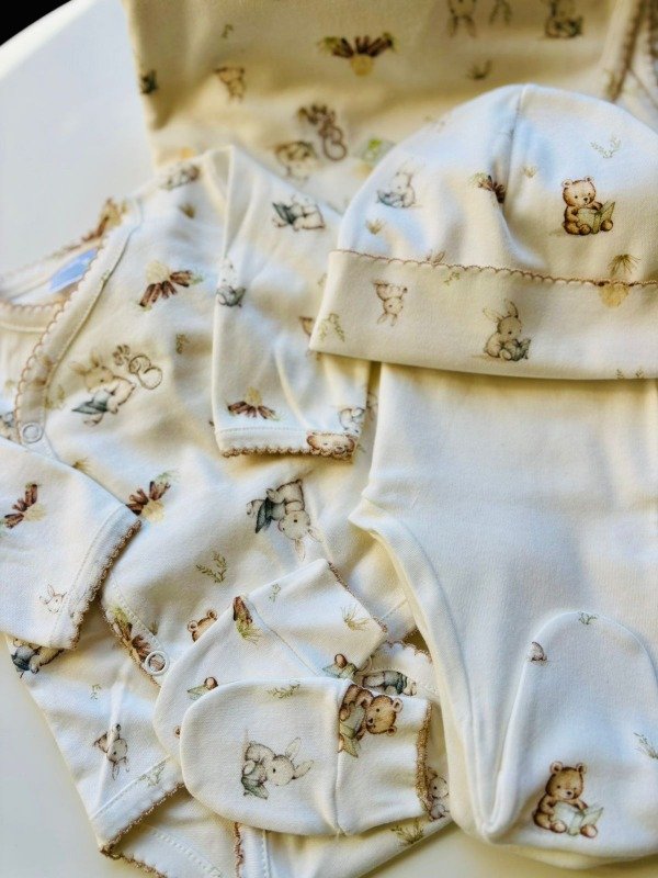 Este ajuar cuenta con lo básico para los primeros momentos. Para completarlo aún más les recomendamos sumarle una camperita en pima simple y, el enterito de apertura delantera